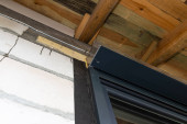 Światło czujnika ruchu zamontowane na elewacji budynku nad bramą garażową w kolorze antracytowym.