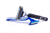 Nowa golarka elektryczna i żyletki na białym.