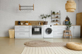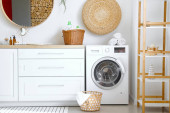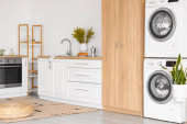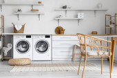 Zdjęcie "Wnętrze jasnej kuchni z pralkami, koszem na pranie i białymi licznikami" może być wykorzystywane do celów osobistych i komercyjnych zgodnie z warunkami zakupionej licencji Royalty-free. Obraz jest dostępny do pobrania w jakości wysokiej rozdzielczości do 5760x3840.