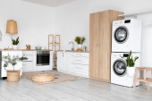 Wnętrze jasnej kuchni z pralkami, koszem na pranie i białymi licznikami