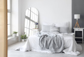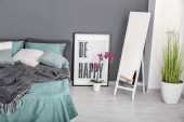 Wnętrze jasnej sypialni z żonkilami w wazonie i lustrze