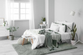 Wnętrze jasnej sypialni z żonkilami w wazonie i roślinach domowych
