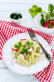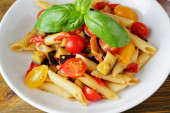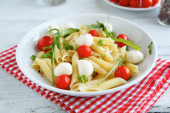 Makaron z warzywami i plasterki sera mozzarella w płycie