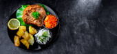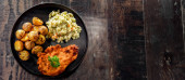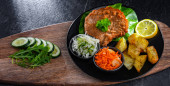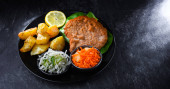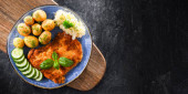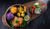 Kotlet wieprzowy panierowany pokryty okruchami chleba z ziemniakami i sałatkami warzywnymi