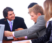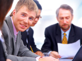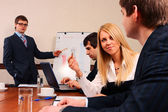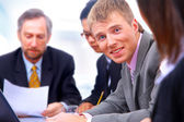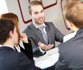 koledzy siedzący przy stole i dyskusji podczas spotkania biznesowego