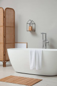 Zdjęcie "Przytulne wnętrze łazienki ze stylową wanną ceramiczną" może być wykorzystywane do celów osobistych i komercyjnych zgodnie z warunkami zakupionej licencji Royalty-free. Obraz jest dostępny do pobrania w jakości wysokiej rozdzielczości do 5760x3840.
