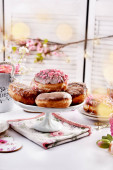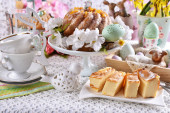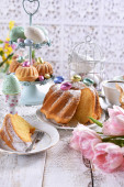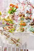 Stolik wielkanocny z sałatkami, jajkami i tradycyjnym białym barszczem z przepiórczym jajkiem, marchewką i kiełbasą