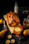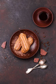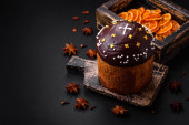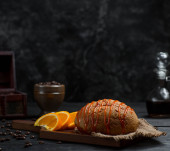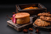 Pyszne świeże rolki z dżemem morelowym na ciemnym betonowym tle. Pyszne domowe wypieki