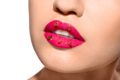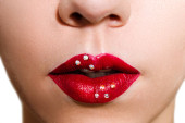 Młoda kobieta z czerwonymi ustami makijaż na szarym tle, zbliżenie