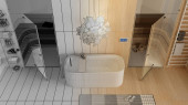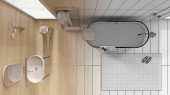 Projekt architektoniczny wnętrz: ręcznie rysowany projekt, który staje się realny, łazienka, spa, wanna wolnostojąca, prysznic, mozaika, regały, półki. Widok z góry, powyżej