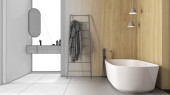 Zdjęcie "Minimalistyczny drewniany pokój spa w odcieniach szarości, łazienka, centrum odnowy biologicznej z wanną, sauna z drzwiami szklanymi, stojak z ręcznikami, półki, dywan, lampa wisząca. Pomysł na projekt wnętrza" może być wykorzystywane do celów osobistych i komercyjnych zgodnie z warunkami zakupionej licencji Royalty-free. Obraz jest dostępny do pobrania w jakości wysokiej rozdzielczości do 5760x3840.