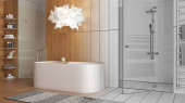 Projekt architektoniczny wnętrz: ręcznie rysowany projekt, który staje się realny, łazienka, spa, wanna wolnostojąca, prysznic, mozaika, regały, półki. Widok z góry, powyżej