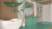 Zdjęcie "Nowoczesna drewniana łazienka, w turkusowych kolorach, w stylu spa, wolnostojąca wanna, prysznic z mozaiką, stojak i półki z akcesoriami. Widok z góry. Pomysł na projekt wnętrza" może być wykorzystywane do celów osobistych i komercyjnych zgodnie z warunkami zakupionej licencji Royalty-free. Obraz jest dostępny do pobrania w jakości wysokiej rozdzielczości do 5760x3840.