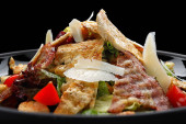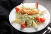Sałatka z filetem z kurczaka, jaja, na czarnym tle z miejscem na tekst