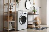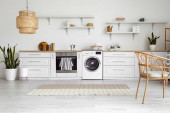 Zdjęcie "Wnętrze jasnej kuchni z pralką, białe lady i stół jadalny" może być wykorzystywane do celów osobistych i komercyjnych zgodnie z warunkami zakupionej licencji Royalty-free. Obraz jest dostępny do pobrania w jakości wysokiej rozdzielczości do 5760x3840.