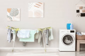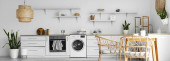 Wnętrze jasnej kuchni z pralką, białe lady i stół jadalny