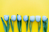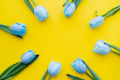 Widok z góry bukiet niebiesko-żółtych tulipanów na ukraińskiej fladze z cieniem