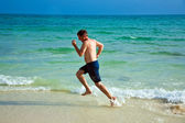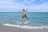 młody chłopak wyskakując z wody na tropikalnej plaży