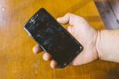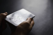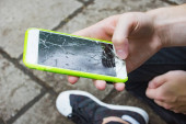 Młody człowiek podniósł smartfona z podłogi i odkrył, że smartfon, który odebrał, miał pęknięty ekran. smartfon, którego ekran jest uszkodzony przez kroplę i wymaga naprawy