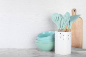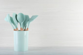 Uchwyt z różnymi naczyniami kuchennymi na białym drewnianym stole. Miejsce na tekst