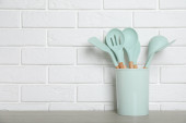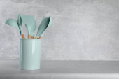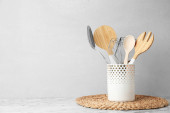 Zdjęcie "Uchwyt z różnymi naczyniami kuchennymi na białym drewnianym stole. Miejsce na tekst" może być wykorzystywane do celów osobistych i komercyjnych zgodnie z warunkami zakupionej licencji Royalty-free. Obraz jest dostępny do pobrania w jakości wysokiej rozdzielczości do 5760x3840.