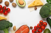 Rama różnych produktów na jasnozielonym tle, płaska leżała z miejscem na tekst. Dieta ketonowa