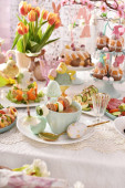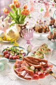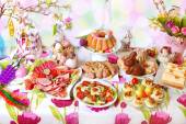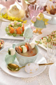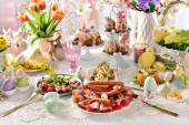 Stolik wielkanocny z sałatkami, jajkami i tradycyjnym białym barszczem z przepiórczym jajkiem, marchewką i kiełbasą