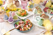 Zdjęcie "Stolik wielkanocny z sałatkami, jajkami i tradycyjnym białym barszczem z przepiórczym jajkiem, marchewką i kiełbasą" może być wykorzystywane do celów osobistych i komercyjnych zgodnie z warunkami zakupionej licencji Royalty-free. Obraz jest dostępny do pobrania w jakości wysokiej rozdzielczości do 5760x3840.
