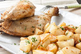 Pieczone udka z kurczaka z ziemniakami na płytce.