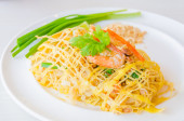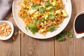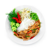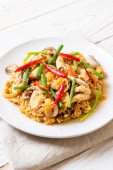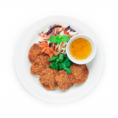 Chrupiące małże Naleśniki azjatyckie jedzenie serwowane słodki sos chili rzeźbienie cebuli wiosna topview