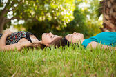 Szczęśliwa para. Kochankowie leżą na trawie. Piękna dziewczyna z długimi ciemnymi włosami i młodym facetem. Pojęcie szczęśliwej pary, środowiska, natury