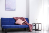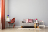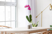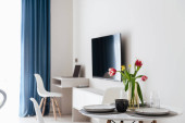 Wazon z hiacynt kwiaty, filiżanka i świeca na stole przy lekkiej ścianie