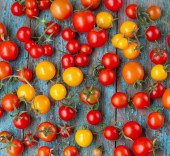 Zdjęcie "Kolorowe pomidory widok z góry. Wzór żółtych, czerwonych i pomarańczowych pomidorów wiśniowych. Latem zbiorów pomidorów warzyw" może być wykorzystywane do celów osobistych i komercyjnych zgodnie z warunkami zakupionej licencji Royalty-free. Obraz jest dostępny do pobrania w jakości wysokiej rozdzielczości do 5760x3840.