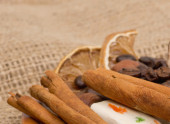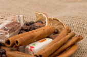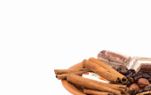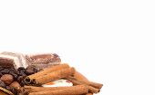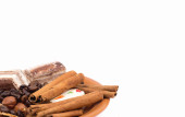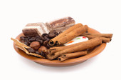 słodycze, cynamon, orzechy i ziarna kawy na spodek