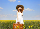 rudy Czarodziejka z walizką na polu rzepaku wiosną.