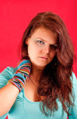 dziewczyna siedzi w światło koszulkę i czarne rękawiczki