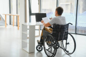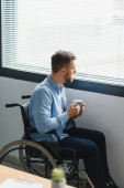 Młody niepełnosprawny mężczyzna siedzi na wózku inwalidzkim przy oknie