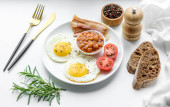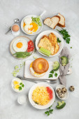 Różne sposoby gotowania jaj kurzych na jasnym tle. Pomysł na śniadanie. Płaskie ułożenie, widok z góry, przestrzeń do kopiowania