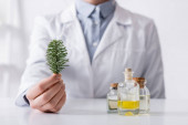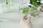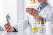 przycięty widok asystenta laboratoryjnego trzymającego pęsetę z liśćmi mięty w pobliżu surowicy w laboratorium