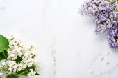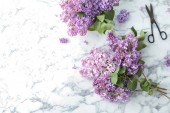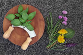 Świeże ziołowe przyprawy do gotowania tworzące abstrakcyjne tło na marmurze. Koncepcja zdrowego gotowania. Płaskie ułożenie, widok z góry, przestrzeń do kopiowania.