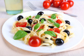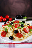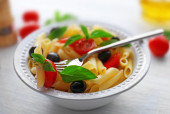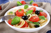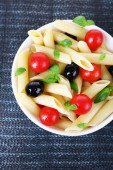 Makaron z pomidorami, oliwkami i bazylią pozostawia w misce na tle ciemnej tkaniny