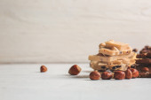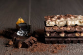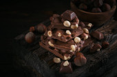 Kawałki smacznej czekolady z orzechami laskowymi na ciemnym drewnianym tle
