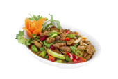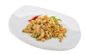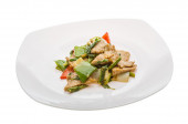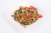 smażona mielona wieprzowina smażona papryka chili i słodka bazylia na talerzu na białym tle