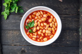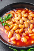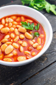 Biała fasola sos pomidorowy białko fasola jedzenie świeże zdrowy posiłek dieta przekąska na stole kopia przestrzeń żywności tło keto lub dieta paleo