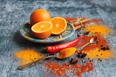 Zdjęcie "Żywa martwa natura z pomarańczami i przyprawami. Kolorowy obraz przypraw aromatycznych. Ciemnoszare teksturowane tło z przestrzenią do kopiowania. " może być wykorzystywane do celów osobistych i komercyjnych zgodnie z warunkami zakupionej licencji Royalty-free. Obraz jest dostępny do pobrania w jakości wysokiej rozdzielczości do 5760x3840.