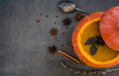 Żywa martwa natura z pomarańczami i przyprawami. Kolorowy obraz przypraw aromatycznych. Ciemnoszare teksturowane tło z przestrzenią do kopiowania.
