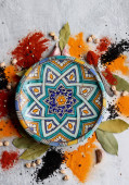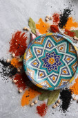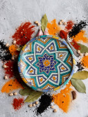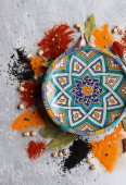 Zdjęcie "Pomarańcze, czerwony pieprz, papryka w proszku, kurkuma i anyż widok z góry zdjęcie. Przyprawy na stole. Pikantne przygotowanie posiłku w trakcie. Kolorowa martwa natura z owocami. " może być wykorzystywane do celów osobistych i komercyjnych zgodnie z warunkami zakupionej licencji Royalty-free. Obraz jest dostępny do pobrania w jakości wysokiej rozdzielczości do 5760x3840.