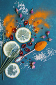 Pomarańcze, czerwony pieprz, papryka w proszku, kurkuma i anyż widok z góry zdjęcie. Przyprawy na stole. Pikantne przygotowanie posiłku w trakcie. Kolorowa martwa natura z owocami.
