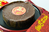 Bandung, Indonezja, 01012021: Kue Keranjang lub Nian Gao na białej tablicy. Trzy NianGao chiński Nowy Rok uroczystości