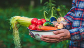 warzywa organiczne. Farmerskie ręce ze świeżo zebranymi warzywami. ukierunkowanie selektywne